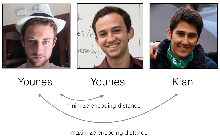 The triplet loss function formalizes this, and tries to "push" the encodings of two images of the same person (Anchor and Positive) closer together, while "pulling" the encodings of two images of different persons (Anchor, Negative) further apart.