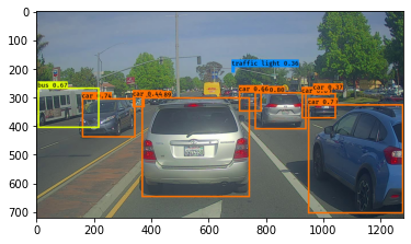 Each cell gives you 5 boxes. In total, the model predicts: 19x19x5 = 1805 boxes just by looking once at the image (one forward pass through the network)! Different colors denote different classes.